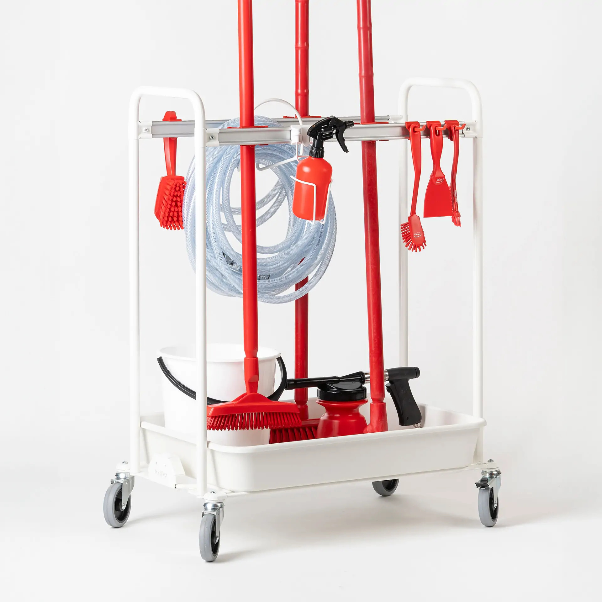 Az eszköztartó kocsik Toolflex eszköztartó sínekkel vannak felszerelve, így a fali tartók minden előnyét nyújtják mobil változatban. Az alsó tálcán további eszközök tárolhatók. Ideális abban az esetben, ha fontos, hogy az eszközök mindig a helyükön legyenek, de maga a takarítás zajlik változó helyeken. Kapható egy-, illetve kétsínes változatban - ez a legrugalmasabb megoldás!